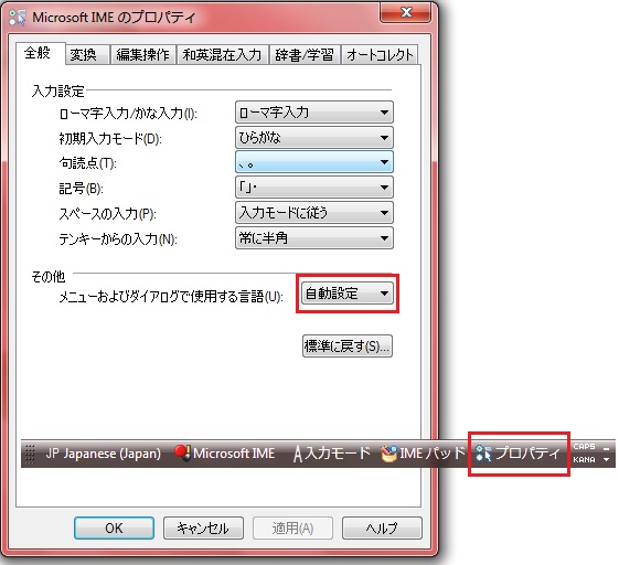 The language bar shown will be in Japanese by default. To change it to English open properties (プロパティ), then select the highlighted box the bottom most option. Then press Ok.